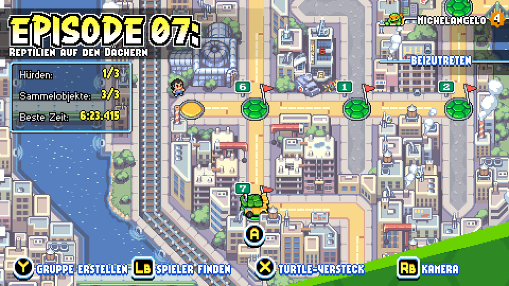 Eine der wohl größten Stärken des Spiels neben dem superflüssigen Gameplay ist wohl der Multiplayer-Part von Shredder’s Revenge. Mit bis zu 5 weiteren Spielern auf Clanjagd zu gehen ist absolut chaotisch und gleichzeitig verdammt witzig. Die Stärke bzw. Lebenspunkte der Bosse skalieren mit, mehr Leute bedeuten als nicht automatisch leichterer Schwierigkeitsgrad. Apropos Schwierigkeitsgrad: ihr könnt zwischen drei Stufen wählen, im Endeffekt ist aber selbst der schwierigste keine unlösbare Aufgabe.