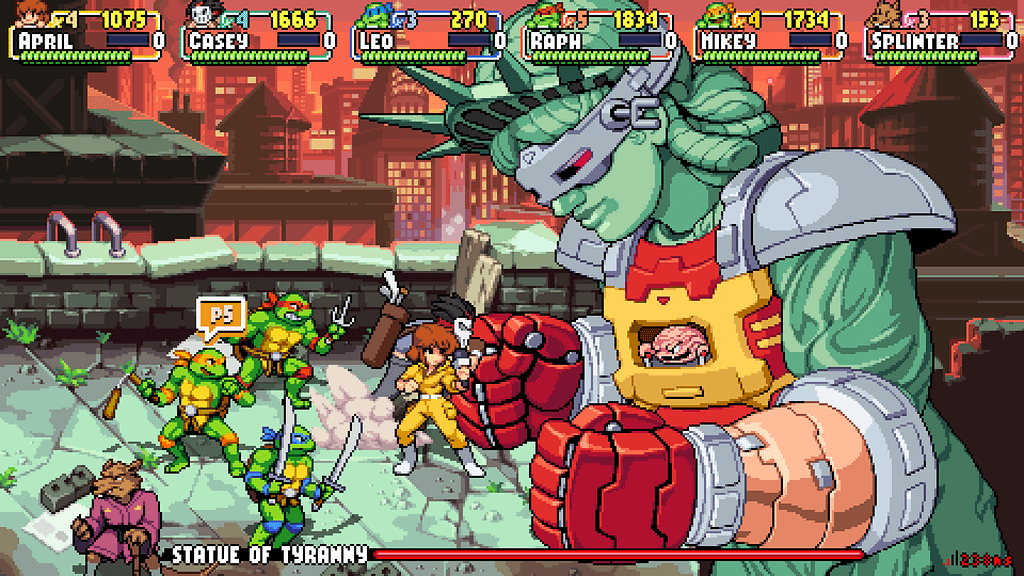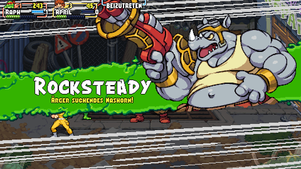 Gameplay und Präsentation lassen keinen Zweifel aufkommen: die Entwickler haben sich ausgiebig mit den Brawlern der Turtles Reihe, und besonders mit Turtles in Time, auseinandergesetzt. Levelintro, Healthbar, Sprites – das alles könnte direkt aus dem 1991er Teil stammen, nur für die aktuelle Generation aufgehübscht.