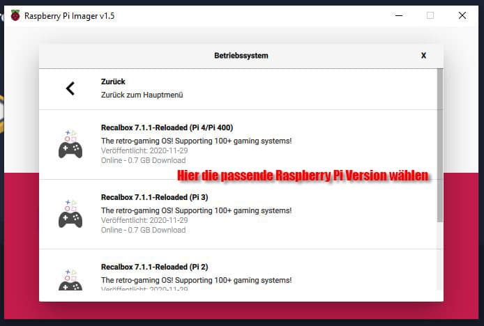 Sobald ihr eure Komponenten alle beisammen und den Raspi zusammengebaut habt geht es nun an die Installation der Software. Dazu besucht ihr die Seite https://download.recalbox.com/de/ und wählt im ersten Schritt Raspberry Pi. Danach klickt ihr die entsprechende Version eures Gerätes an und klickt zum Abschluss auf das Betriebssystem eures Rechners, um die passende Software herunterzuladen.