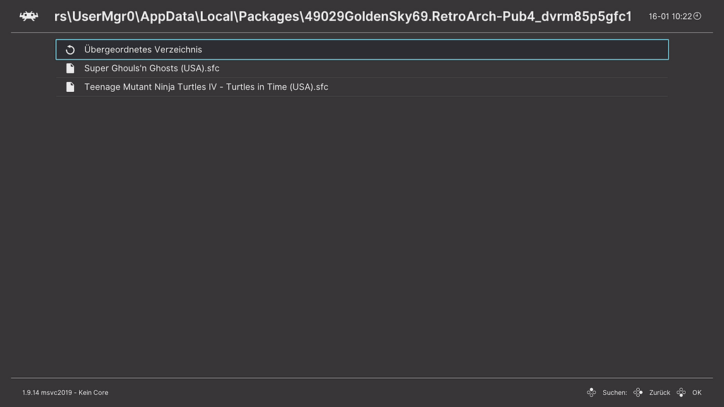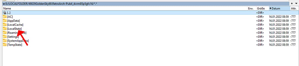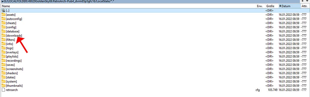 Nun müsst ihr einen Ordner finden, der im Namen „RetroArch“ enthält. ACHTUNG: der Ordnername lautet bei jedem User anders, daher nicht auf den kompletten Namen aus dem Screenshot konzentrieren. Es muss nur „RetroArch“ enthalten sein.