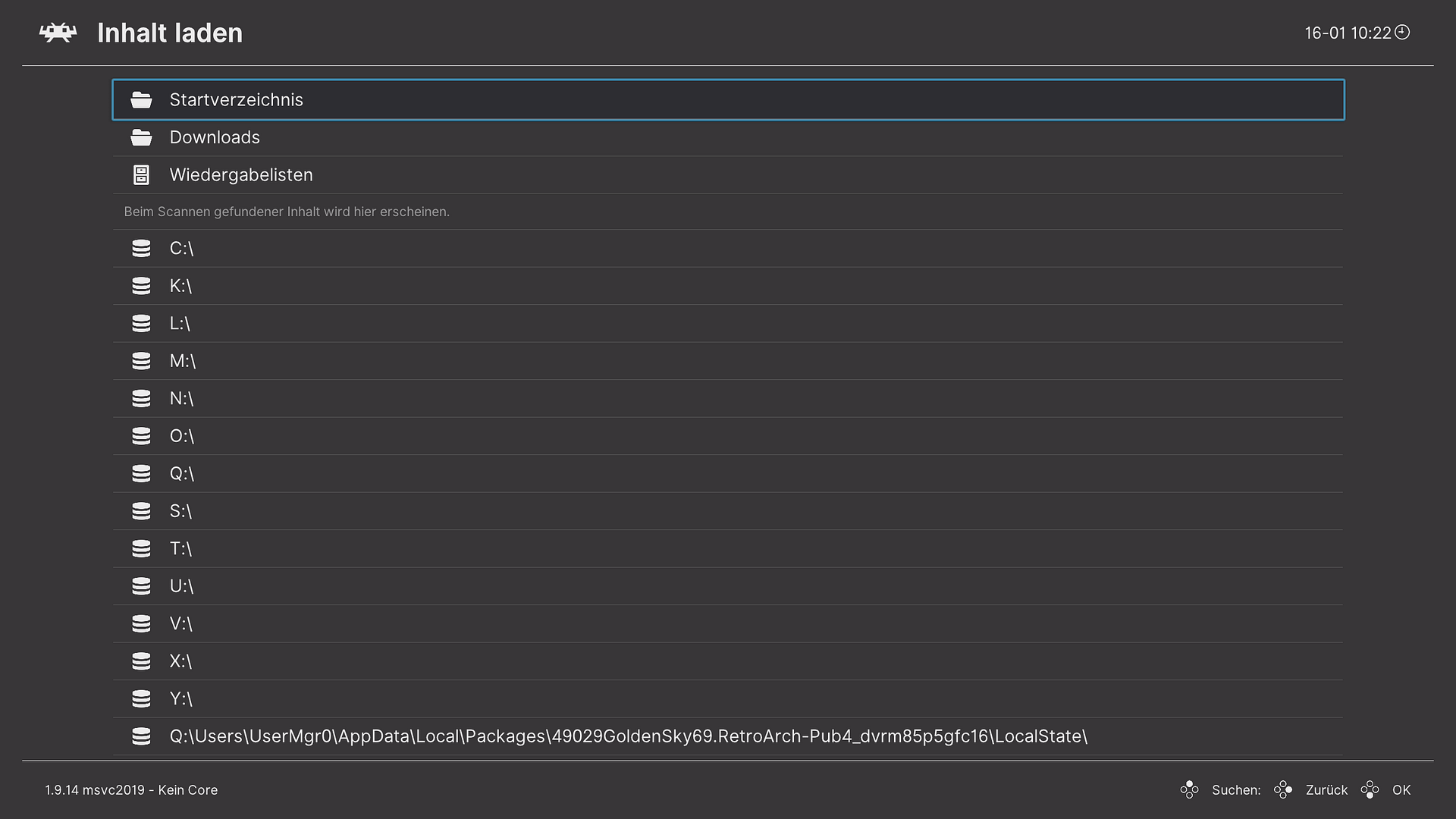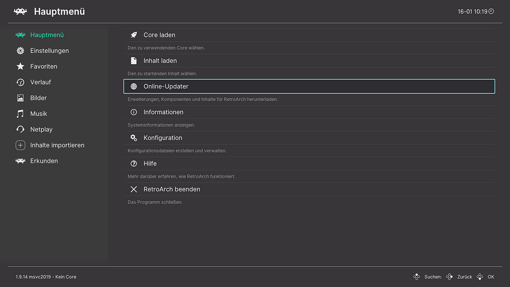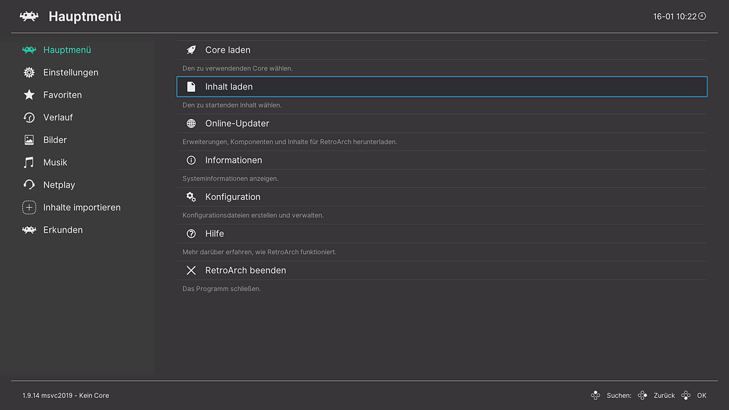 Sobald sich beide Programme auf eurer Xbox befinden startet ihr Retroarch. Ihr solltet nun so ein Fenster sehen: