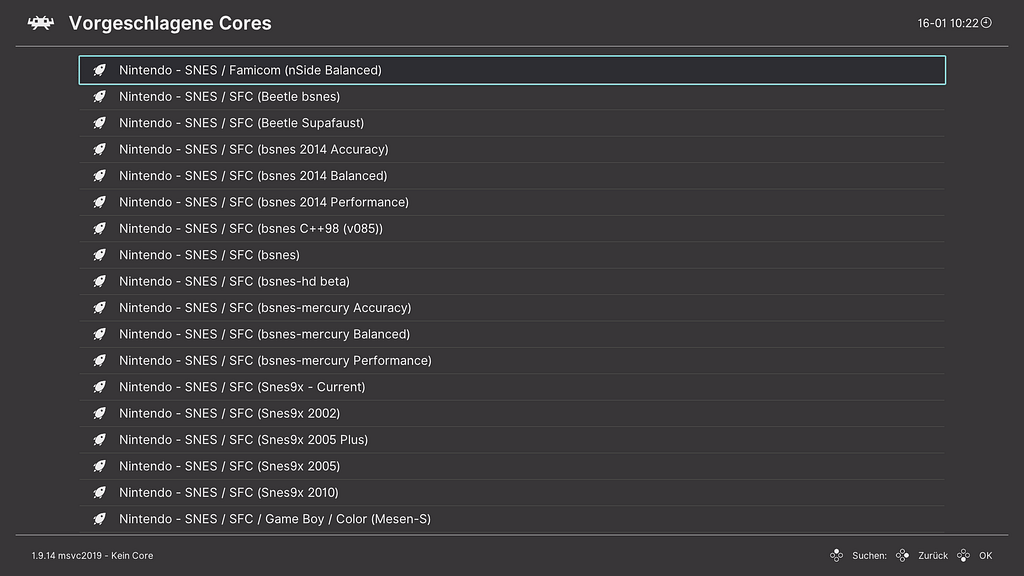 Nun öffnet sich eine Abfrage, in der ihr euren Core auswählen müsst, also quasi eure Emulatorsoftware. Hier müsst ihr einfach für euch ausprobieren, was am besten passt. Für SNES Spiele kann ich beispielsweise den Snes9x -Current empfehlen.