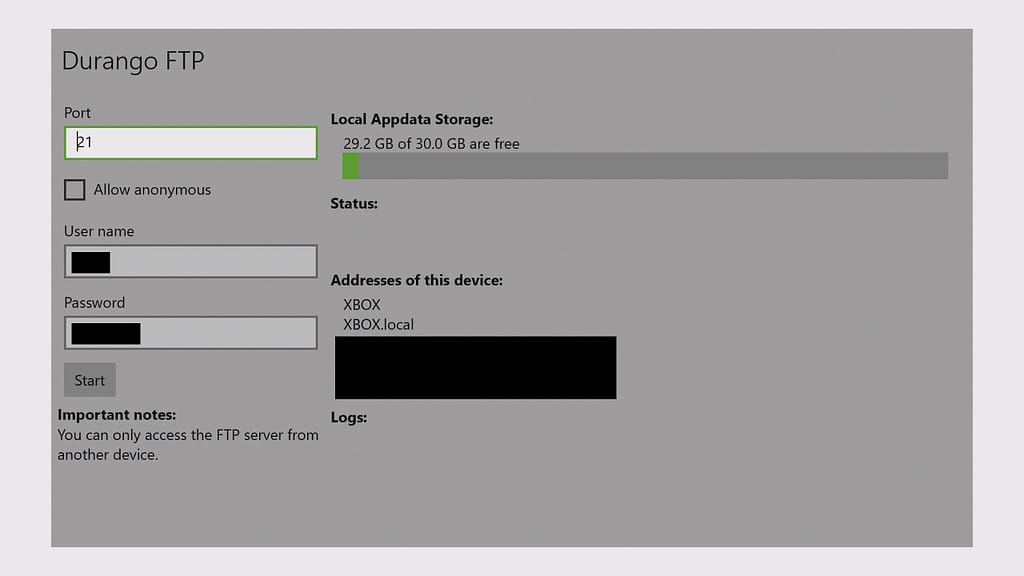 Nun geht ihr an euren PC und verbindeteuch per FTP Programm (ich nutze den Total Commander) mit eurer Xbox. Als Adresse wählt ihr eine Adresse, die im Durango unter „Addresses of this device“ geführt ist, bspw. XBOX. Nach der Adresse könnt ihr einen Doppelpunkt und den Port schreiben, so dass die Adresse im Endeffekt dann so aussieht: XBOX:21